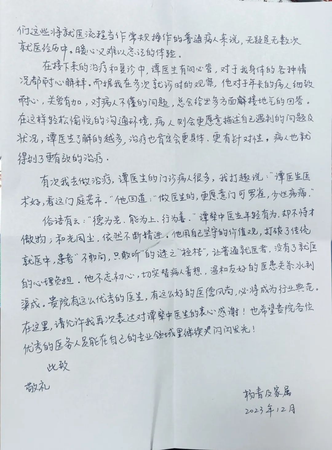 譚醫(yī)生表示,楊女士的認(rèn)可和贊揚(yáng)是他的榮幸,更是對(duì)他今后工作的鞭策。他說(shuō):“為患者提供最好的醫(yī)療服務(wù)是我作為醫(yī)生的職責(zé)。我很高興能收到楊女士的表?yè)P(yáng),但我認(rèn)為這更是一種鼓勵(lì)和肯定,我會(huì)更加努力工作,不辜負(fù)患者的期望?!?/p>