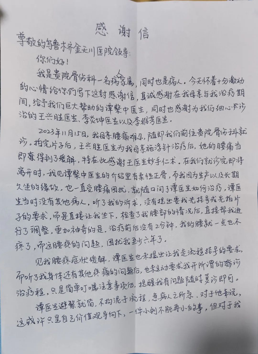 2023年12月28日,一位患者將一面寫有“精醫(yī)重道仁心仁術(shù),和光同塵與時(shí)舒卷”的錦旗和一封表?yè)P(yáng)信送到烏魯木齊金天川醫(yī)院,以此表達(dá)對(duì)金天川醫(yī)院骨傷科譚棨中醫(yī)生及王興盛醫(yī)生、李炎坤醫(yī)生、李雅芳醫(yī)生精湛醫(yī)術(shù)和貼心服務(wù)的感激之情。這面錦旗不僅是對(duì)骨傷科醫(yī)生們的個(gè)人褒獎(jiǎng),更是對(duì)烏魯木齊金天川醫(yī)院對(duì)患者的優(yōu)質(zhì)服務(wù)和診療質(zhì)量的肯定。