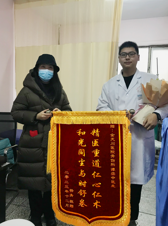對(duì)于譚醫(yī)生來(lái)說(shuō),這是一件小事,但對(duì)于楊女士來(lái)說(shuō),無(wú)疑是無(wú)數(shù)次就醫(yī)經(jīng)歷中暖心又難以忘記的體驗(yàn),楊女士于2023年12月28日將錦旗送到了譚醫(yī)生的手中,并親手將表?yè)P(yáng)信送到了醫(yī)院辦公室,與楊女士溝通后烏魯木齊金天川醫(yī)院領(lǐng)導(dǎo)班子高度重視、積極籌備,為此次受到患者表?yè)P(yáng)的骨傷科醫(yī)師們頒發(fā)了紅包,以資鼓勵(lì);對(duì)他們“以患者為中心”的服務(wù)理念提出表?yè)P(yáng),周少云院長(zhǎng)希望受表獎(jiǎng)的同事要不驕不躁、繼續(xù)努力,并且請(qǐng)全院醫(yī)護(hù)人員都能時(shí)刻做好優(yōu)質(zhì)服務(wù)并銘記:每一次患者的微笑、每一次患者的感謝,都是對(duì)我們工作的最高認(rèn)可。都是將患者放在第一位的回報(bào)。
