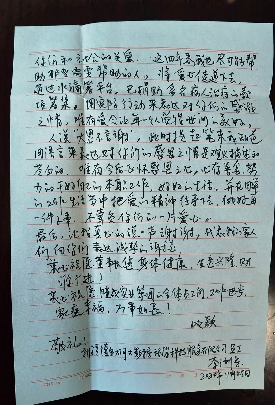 2020年11月27日,集團公司接到一位來自“金雪馳愛心基金”幫扶者(新疆德安大河大數(shù)據(jù)環(huán)??萍挤?wù)有限公司員工)李先生的登門答謝。